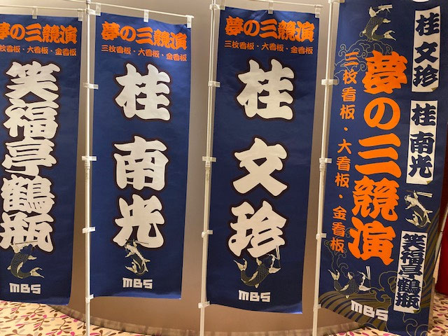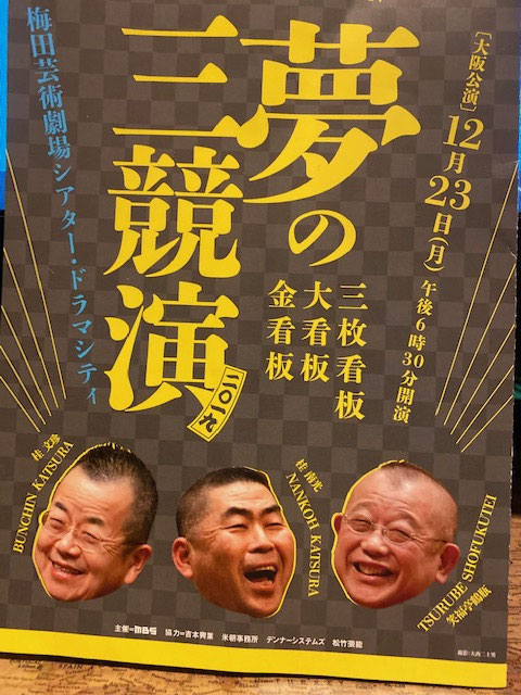 梅田芸術劇場にて、夢の三競演「三枚看板・大看板・金看板」という落語会へお出かけしました。2年連続で抽選に外れて、今年やっとチケットが取れたほどで、即日完売の、桂文珍、桂南光、笑福亭鶴瓶という今や大御所となられた師匠方の落語会です。(敬称略)