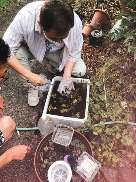 「ここから好きなだけすくっていって」という発泡スチロールのケースには、100匹近くいるはずと、T君は言いますが、ヤゴが大量に発生していて、メダカたちは相当数捕食されてしまっていて、10数匹すくえただけでした。ちょうどトンボが横の池(ビオトープ)に卵を生みに来ていました。T君ご立腹です。